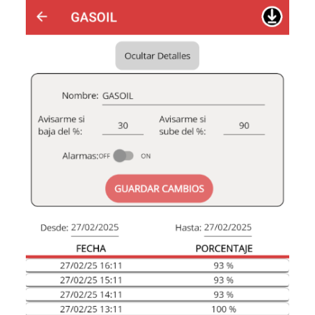 Podrás visualizar el historial del nivel de los diferentes depósitos en el rango de fechas que tu elijas.